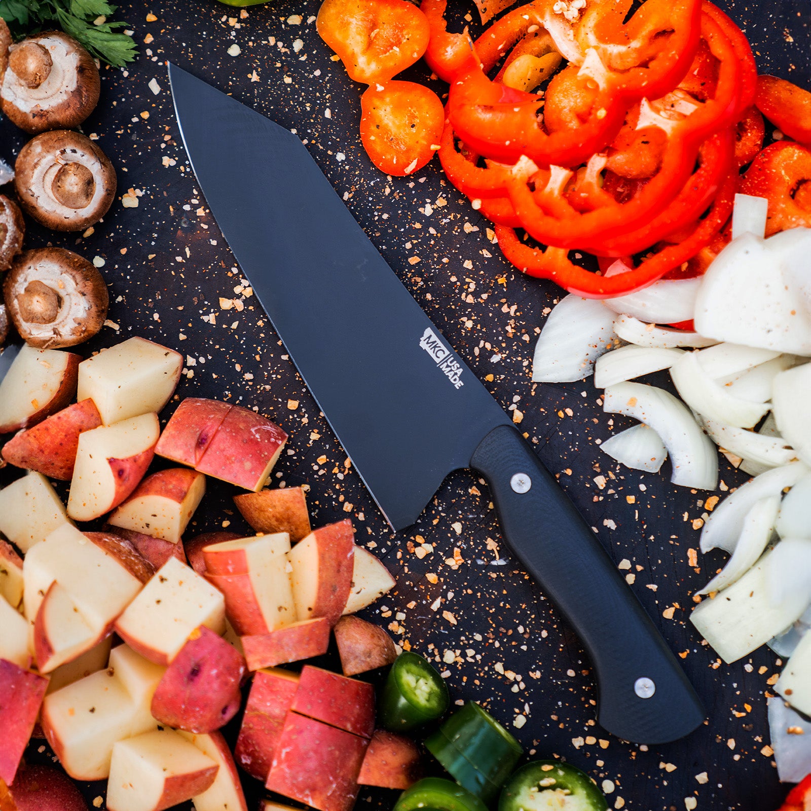 In Japanese cooking, the santoku knife typically serves as a vegetable knife. It’s handy for slicing, dicing, chopping, and mincing things like carrots, peppers, onions, cabbage, and any other veggies, fruits, herbs or seafood in your kitchen.