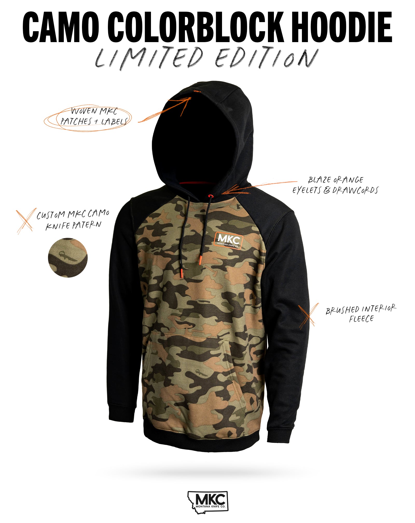 Featuring the two-tone black and camo design, it's the perfect blend of style and functionality, making it an essential piece of gear for any adventure. Featuring a custom camo knife pattern and blaze orange trims, this hoodie blends seamlessly into the backcountry yet is bold enough to stand out anywhere else.