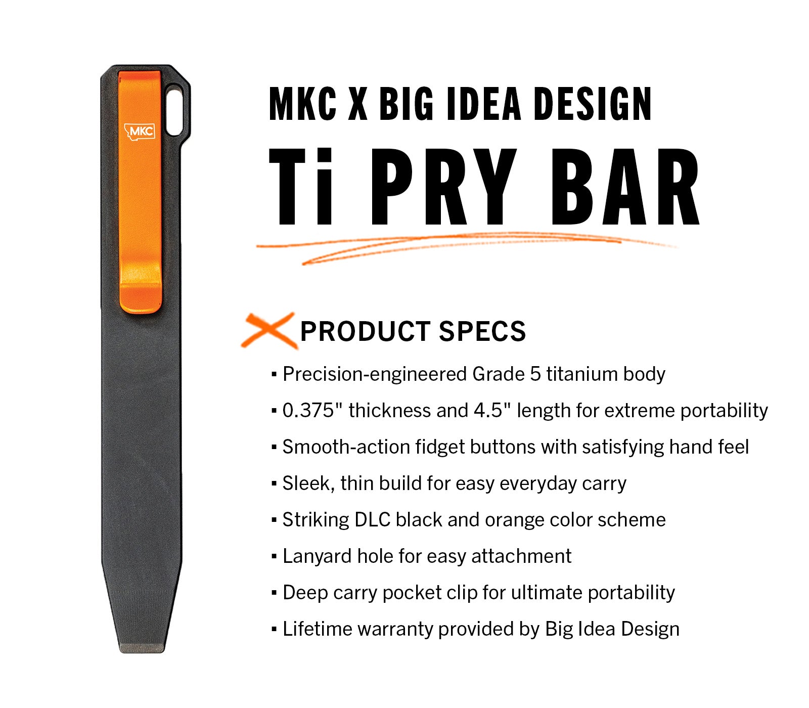 The MKC x Big Idea Design Ti Pry Bar features a black DLC body with orange accents, magnetic fidget buttons, and a deep carry pocket clip. The fidget buttons feel great to hold and keep it secure in your pocket without stealing room from other items. The Pry Bar is also TSA Friendly, making it great for travel.