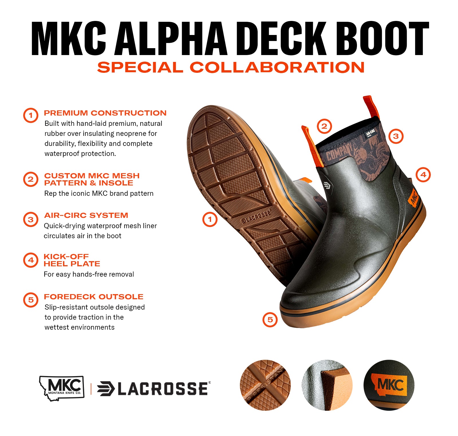 Hand-laid premium rubber over insulating neoprene gives you complete waterproof protection without sacrificing flexibility. These boots feature a custom MKC neoprene cuff and orange accents on the front and back pull tabs. The Air-Circ system keeps your feet comfortable during long days, and the slip-resistant Foredeck outsole holds on wet decks, muddy trails, or icy parking lots. From launching the boat at 4 AM to running errands after hunting, we wanted a boot that goes everywhere.